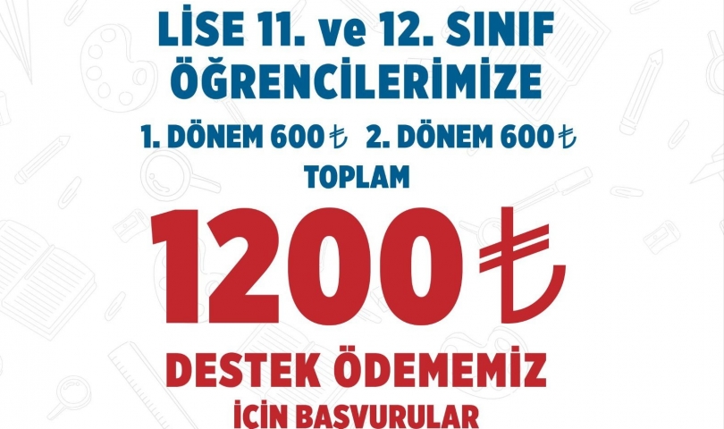 Eğitime destek amaçlı kullanılması amacıyla yapılan yardımda 11 ve 12’nci sınıf öğrencilerine 1’nci dönem ve 2’nci dönem 600’ler lira olmak üzere toplam 1.200 TL nakdi destek sağlanıyor.