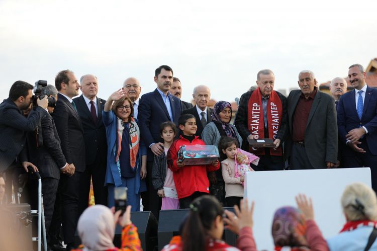 Kahramanmaraş depremlerinden etkilenen Nurdağı’nda, Çevre Şehircilik ve İklim Değişikliği Bakanlığı ve AFAD koordinasyonunda afetten 76 gün sonra, TOKİ standartlarında zemin etütleri yapılarak kaya zemin üzerine, radye temel, betonarme olarak 44 günlük inşaat süresi sonrasında tamamlanan köy evlerinin hak sahiplerine anahtarlarını Gaziantep Büyükşehir Belediye Başkanı Fatma Şahin’in de katıldığı törenle Cumhurbaşkanı Recep Tayyip Erdoğan verdi.