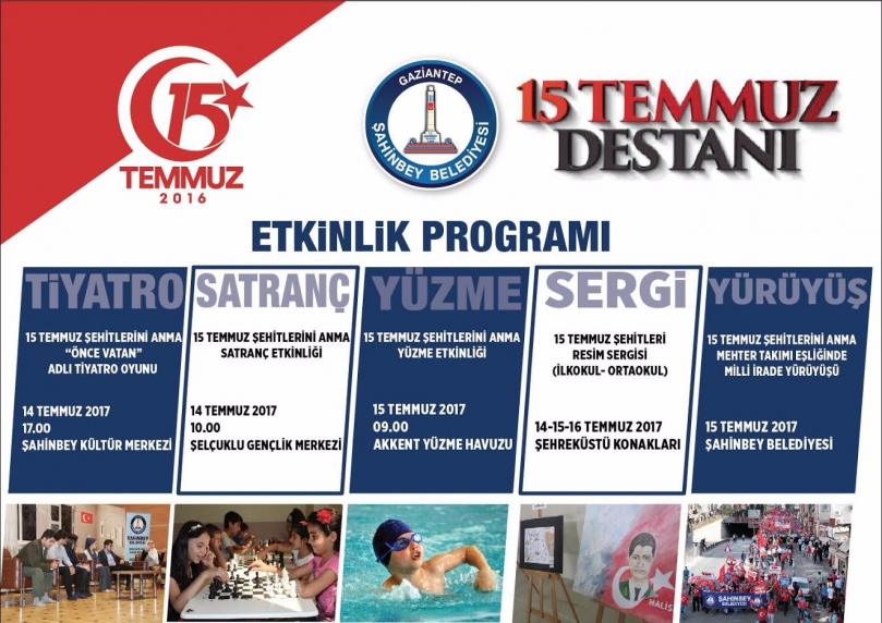 Şahinbey Belediyesi 15 Temmuz Demokrasi Zaferi ve Şehitleri Anma programları kapsamında Önce Vatan isimli Tiyatro gösterisi, satranç turnuvası, şehitleri anma yüzme etkinliği, 15 Temmuz Şehitleri Resim Sergisi ve Milli İrade Yürüyüşü’nden oluşan bir dizi etkinlik düzenleyecek. 14 Temmuz Cuma günü başlayacak etkinlikler, 15-16 Temmuz’a kadar devam edecek.