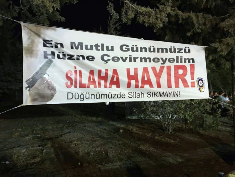 Pankartlarda, "Düğünümüze hoş geldiniz, lütfen silah sıkmayalım. En mutlu günümüzü hüzne çevirmeyelim. Silaha hayır! Düğünümüzde silah sıkmayın" gibi ifadeler yer aldı.